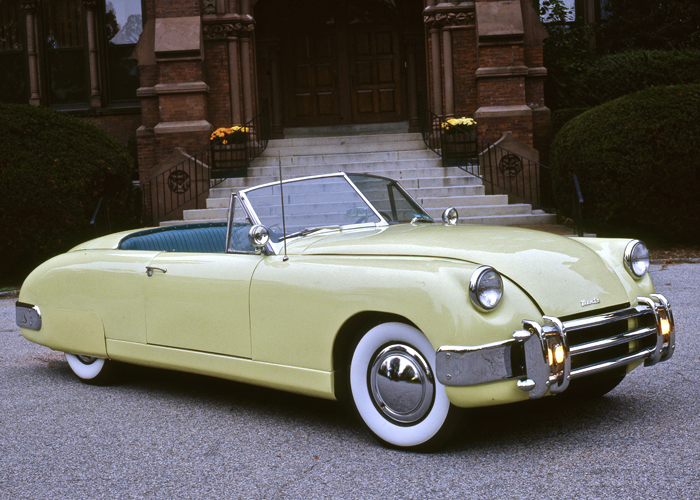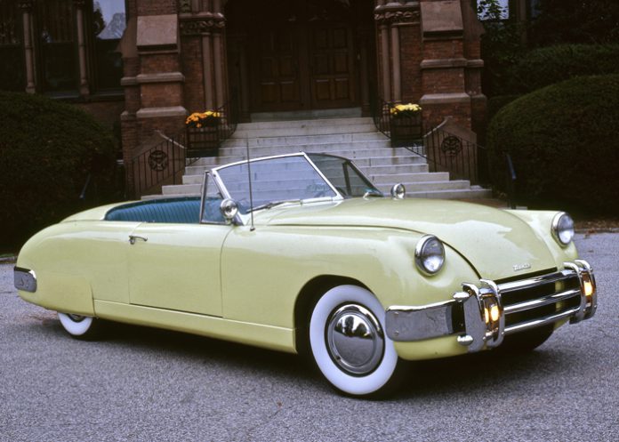 The car’s original color of lemon has been repainted in a soft pastel yellow, with green vinyl interior. This is what the car had when new, although for “an extra charge” an imitation snakeskin design was available. This Muntz has the 1953 Cadillac OHV V8 mated to the GM Hydramatic.