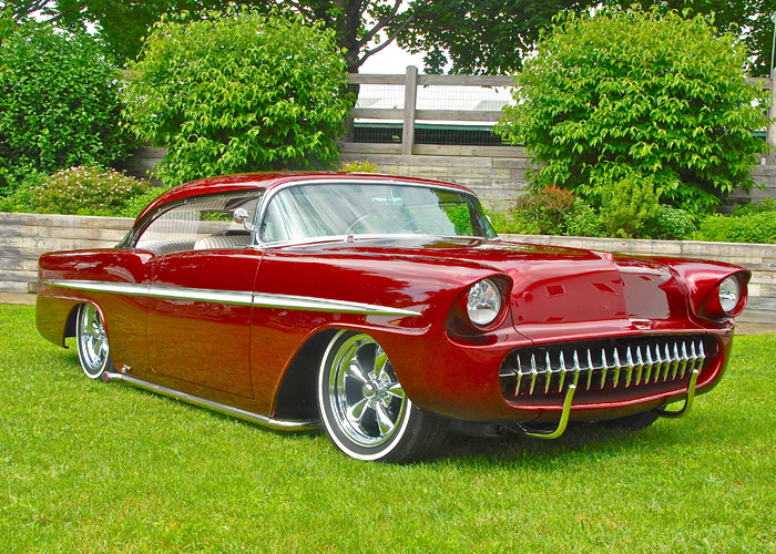 A true custom in Harvey’s eye needs a chopped top, so Harvey chopped two and half inches from the top and molded a scoop at the rear of the top. The color choice is a House of Kolor Candy Burgundy, which is similar to the 1956 Chevy burgundy seen on the 1956 Bel-Air four-door hardtop in the 1956 sales brochure, but the Kandy Burgundy is brighter!