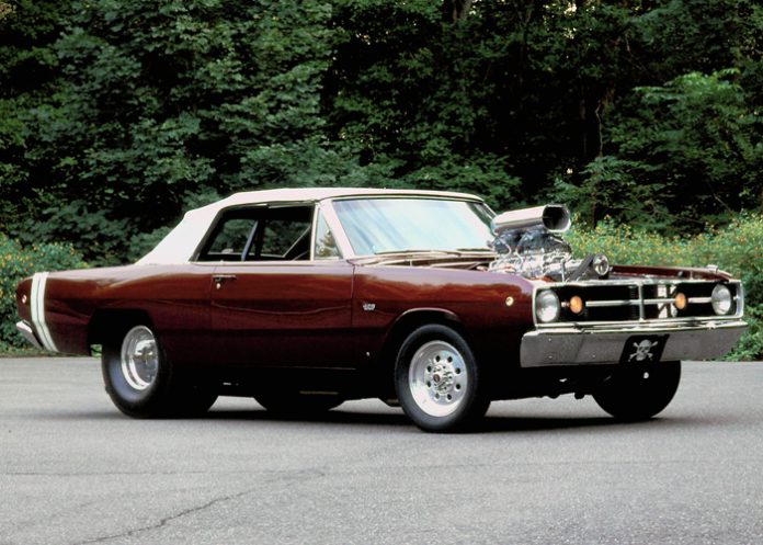 The Dart GTS seen here began life in 1968 as a stock 1968 Dodge Dart convertible with the standard 340 cid V-8. By the end of 1974 it had a new life as one of the first “Pro Street” cars built.