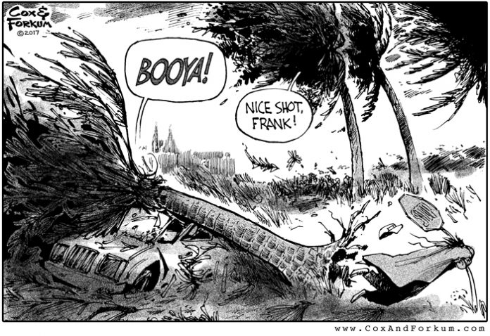 Our biggest problems from Hurricane Irma were no electricity and no gasoline for almost a week. The gas shortage was from the thousands of people driving through our county to escape and then return to South Florida, buying up all our gas in the process. Our gas trucks arrive with about the same frequency as Social Security checks, full moons, and getting three matching numbers and the Powerball on your lottery ticket. So to paraphrase a Jerry Reed song, “When You’re Out, You’re Out!” The electricity was out because the trees were busy falling on power lines when they weren’t preoccupied dropping on small boats in the back of pickup trucks. Our electric company service trucks had headed to South Florida to restore their power, so we had to wait for trucks from Connecticut to restore ours. I guess if Irma had made it to Connecticut, they’d be waiting on service trucks from the North Pole. Santa on a power pole …there’s a thought.